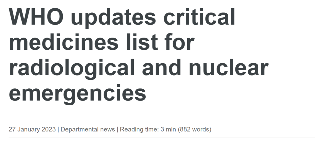 2023年1月27日,世界卫生组织WHO(世卫组织)更新了应对放射性和核紧急情况储备药物清单,以及对其进行适当管理的政策建议。这些储备药物包括预防或减少辐射暴露,或在发生辐射后进行治疗的药物。