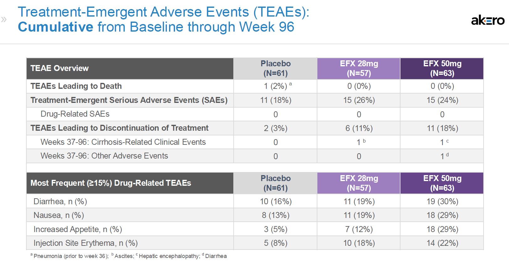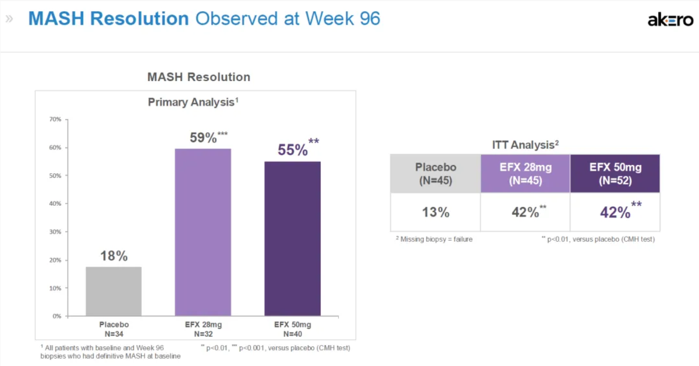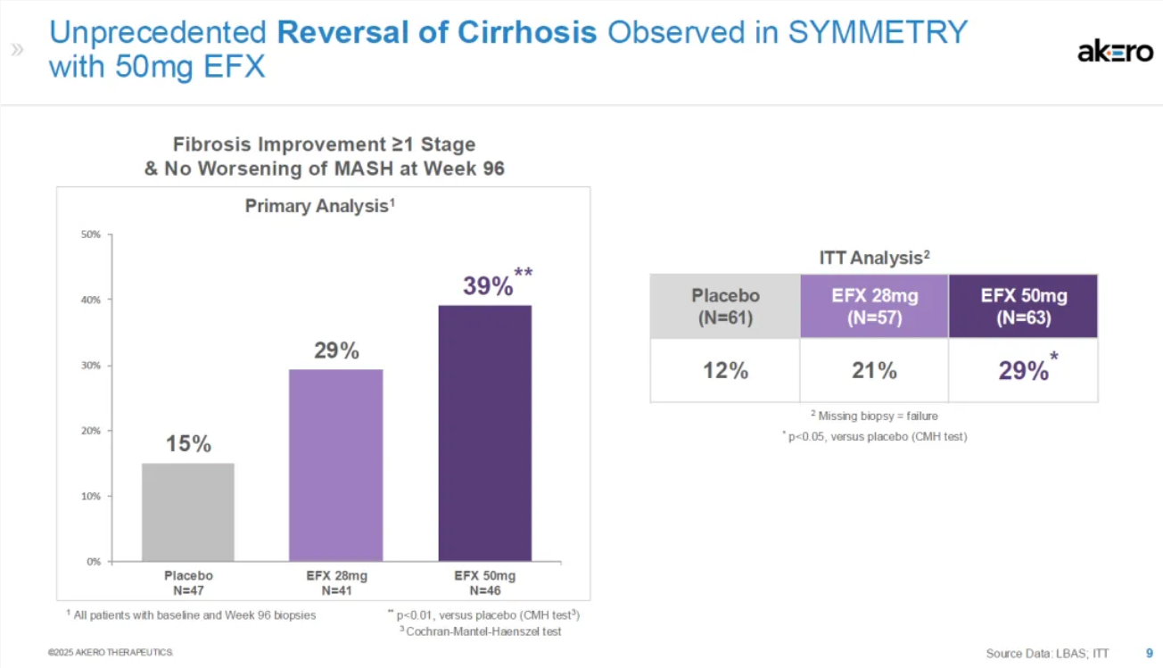 2025年1月27日,Akero 公布SYMMETRY 第 96 周的初步顶线结果。经过96周治疗,50mg高剂量组纤维化改善超过1 stage的比例为39%,ITT分析则为29%。