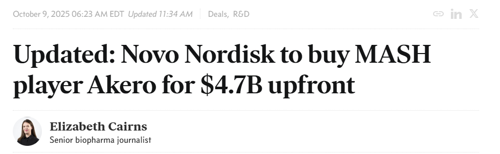 Mike Doustdar在一份声明中表示,Akero 的在研药物有潜力成为治疗代谢功能障碍相关脂肪性肝炎(MASH)的“基石”疗法,既可单独使用,也可与诺和诺德的重磅减肥药Wegovy联合使用。