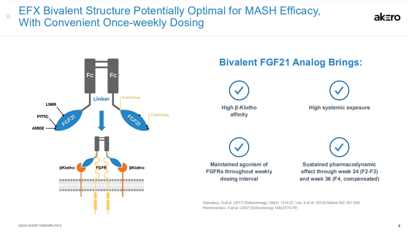 Efruxifermin作为一种 FGF21-Fc 融合蛋白(人 IgG1 Fc 结构域连接到修饰的人 FGF21)。与天然人 FGF21 相比,Efruxifermin 的半衰期延长,受体亲和力增强。