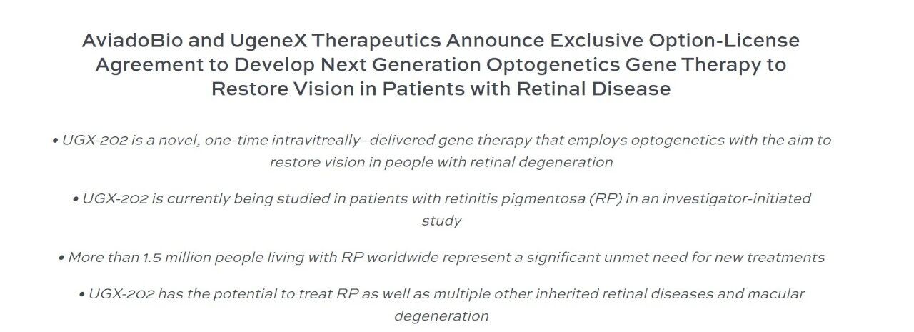 2025年10月9日,AviadoBio与星明优健(UgeneX Therapeutics)宣布,双方就光遗传学管线UGX-202的开发和商业化达成独家选择权及许可协议。UGX-202是一款处于临床开发阶段的腺相关病毒(AAV)基因疗法,用于治疗视网膜色素变性(RP)患者,第二种未公开的适应症将于年底进入临床阶段。