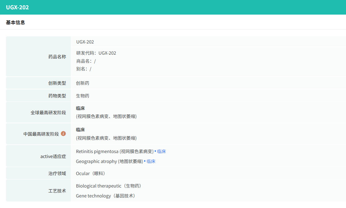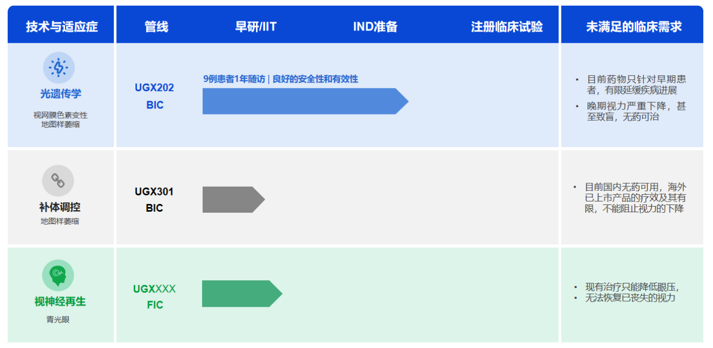 UGX202 是星明优健新一代光遗传学在研产品,以自研AAV病毒为载体,搭载宽光谱及高敏感度的创新光敏蛋白,特异性感染视网膜神经节细胞并赋予感光功能,重建中晚期感光细胞退行性疾病患者视觉通路。UGX202作为跨基因突变的“通用型”创新基因疗法,突破了罕见病患者数量限制,适用于多个疾病人群,包括视网膜色素变性、Stargardt病、无脉络膜症、及晚期干性年龄相关黄斑病变等。UGX-202的衣壳、调控序列以及视蛋白转基因均经过优化,有望实现同类最佳的临床表现。