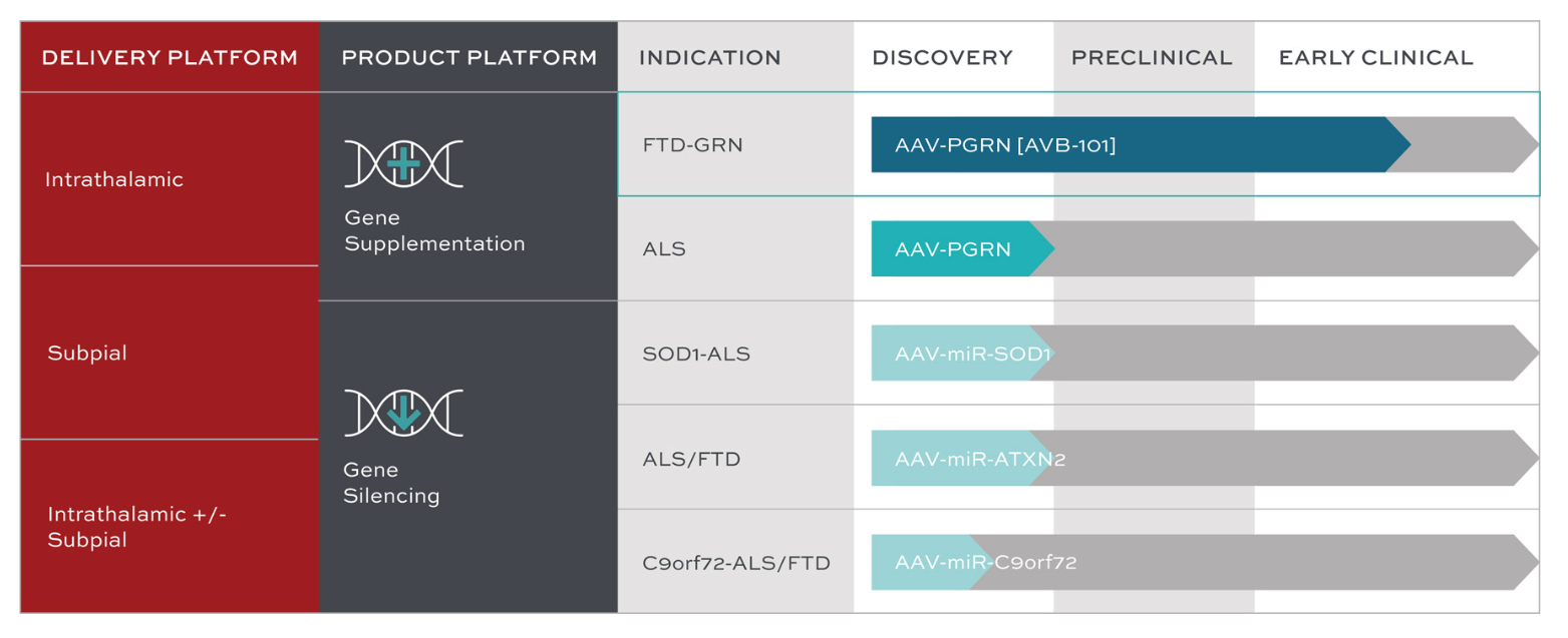 AviadoBio目前的研发管线以AVB-101为核心,这是一种一次性给药的AAV基因疗法,正在一项1/2期临床研究中用于评估治疗携带GRN基因突变的额颞叶痴呆患者。该疗法已引起安斯泰来(Astellas)的关注,后者去年支付了5000万美元以获得该药物的期权许可。