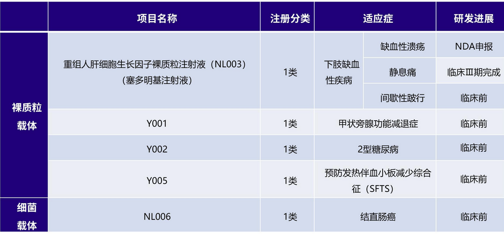 公司目前核心在研产品有:塞多明基注射液,该药物初步显示了在严重肢体缺血(CLTI)治疗中的临床转化价值。即研发的重组人肝细胞生长因子裸质粒注射液(代号NL003);目前递交了新药上市申请NDA。