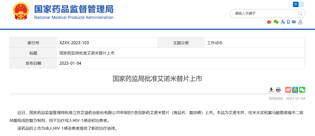2023年1月4日,药监局官网显示,艾迪药业递交的1类新药获批上市。艾诺米替片(商品名:复邦德)为艾诺韦林、拉米夫定和富马酸替诺福韦二吡呋酯组成的复方制剂,用于治疗成人HIV-1感染初治患者。