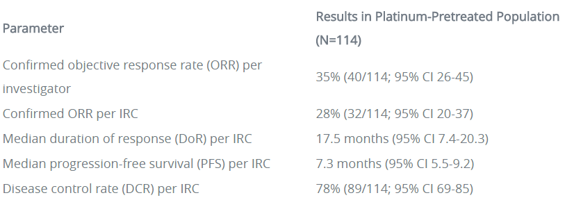 临床数据显示,莫博赛替尼160mg QD治疗114例铂类化疗经治患者(PPP队列,包括6例剂量递增队列+22例剂量扩展队列1+86例EXCLAIM队列患者),独立审查委员会(IRC)确认的ORR为28%,研究者确认的ORR为35%。并且,无论插入突变发生在近环(near-loop)或远环(far-loop),ORR都相似,分别为29%和25%。莫博赛替尼起效迅速且疗效持久,中位起效时间为1.9个月,中位缓解持续时间(DoR)为17.5个月。中位OS为24个月,中位无进展生存期(PFS)为7.3个月。
