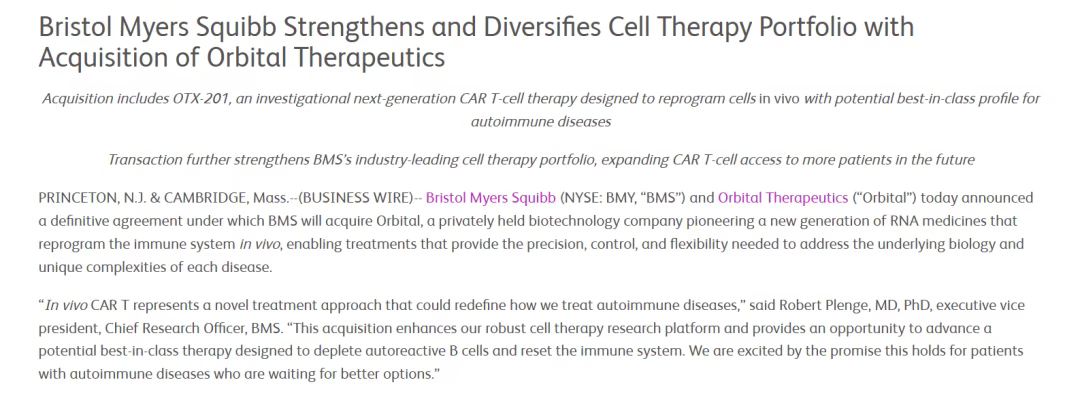 10月10日,BMS宣布将以15亿美元现金收购Orbital,以加强细胞疗法管线组合。收购包括一款在研下一代CAR-T细胞疗法OTX-201,该项目在体内重编程细胞,具有治疗自身免疫性疾病的best-in-class潜力。
