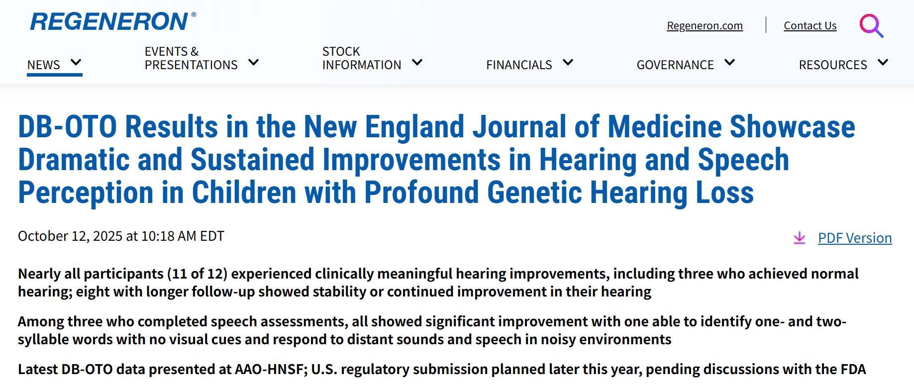 2025年10月12日,再生元宣布其研究性基因疗法DB-OTO的最新数据已发表在期刊《新英格拉医学杂志,NEJM》和美国耳鼻喉头颈外科学会(AAO-HNSF)年会上。关键的CHORD试验的最新结果显示:12名参与者中,11名患者得到了具有临床意义的听力改善,其中3名达到正常听力水平。此外,8名经过长期随访的参与者的听力表现稳定或持续改善,3名完成言语评估的参与者均表现出显著改善。