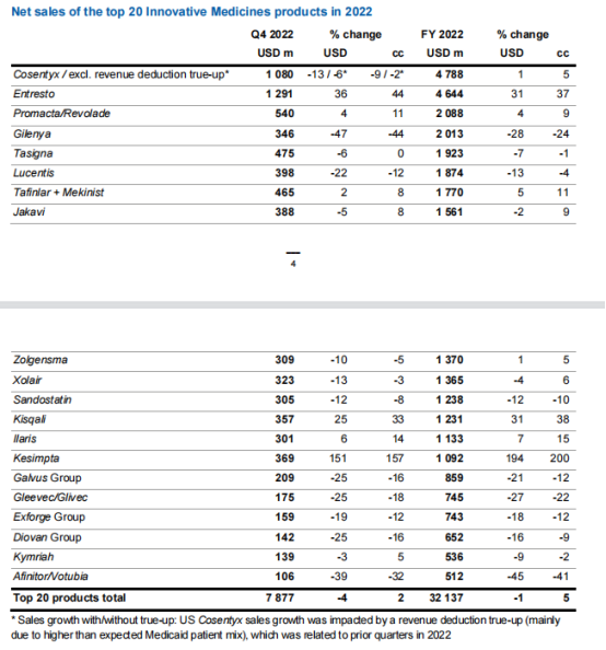 诺华2022年产品销售top20