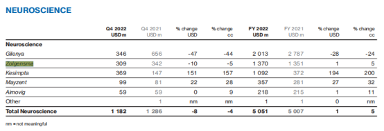 Zolgensma在2022年Q4营收3.09亿美元,下降10%(按照USD),主要由于报销以及新增患者使用数量原因,公司表示环比销售相对稳定。此外销售下降还可能与两名儿童患者在用药期间死亡的负面消息有关。