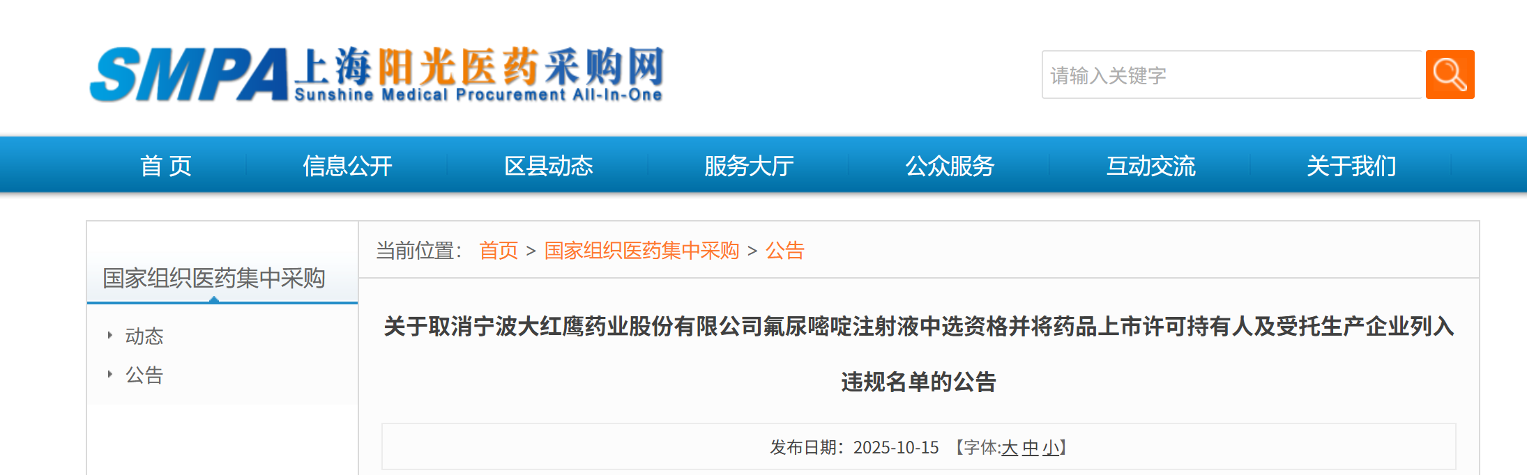经国家组织药品联合采购办公室相关成员单位集体审议,宁波大红鹰药业股份有限公司违背在申报材料中作出的承诺,与其受托生产企业黑龙江福和制药集团股份有限公司违反《全国药品集中采购文件(GY-YD2024-2)》有关条款。联合采购办公室决定取消宁波大红鹰药业股份有限公司氟尿嘧啶注射液中选资格,同时将宁波大红鹰药业股份有限公司和黑龙江福和制药集团股份有限公司列入“违规名单”,暂停两家企业自2025年10月15日至2027年4月14日参与国家组织药品集中采购活动的申报资格。