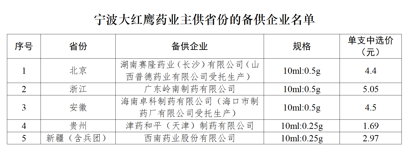 由宁波大红鹰药业股份有限公司作为氟尿嘧啶注射液主供企业的省份,应按照《全国药品集中采购文件(GY-YD2024-2)》相关条款启动替补程序,由备供企业替补成为主供企业,并按本企业中选价格供应;当新确认的主供企业不能满足供应需求时,由所在省份启动增补备供企业流程。