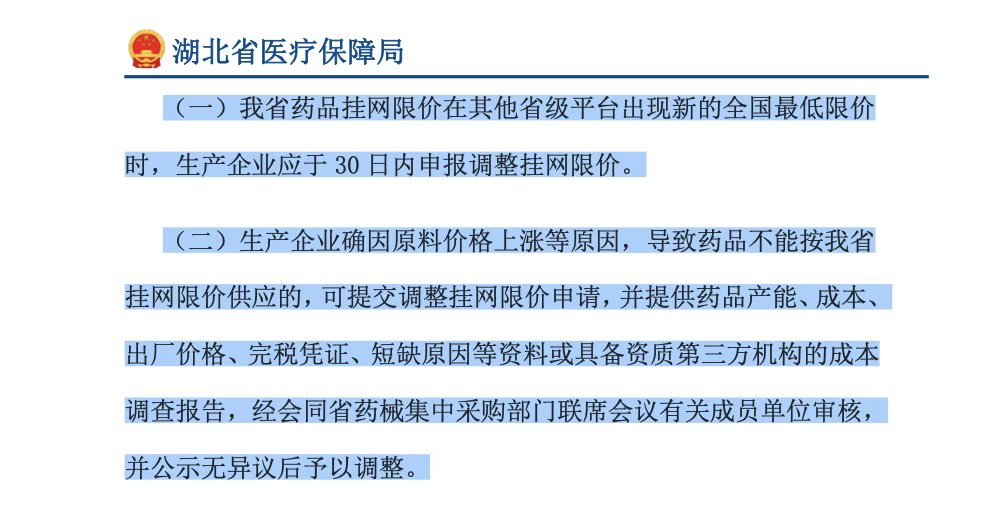 特别指出,当湖北省药品挂网限价在其他省级平台出现新的全国最低限价时,生产企业应于30日内申报调整挂网限价。