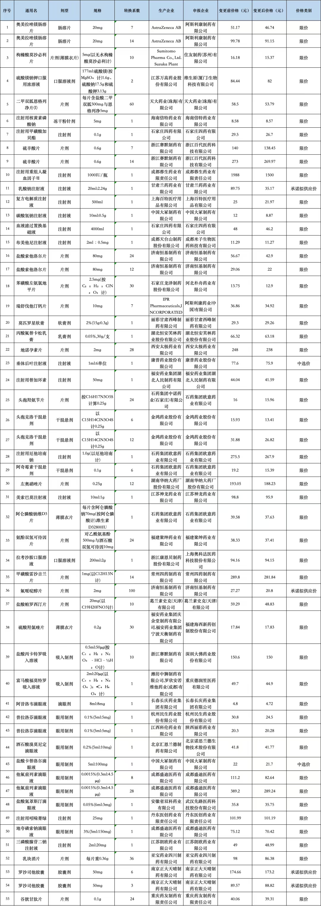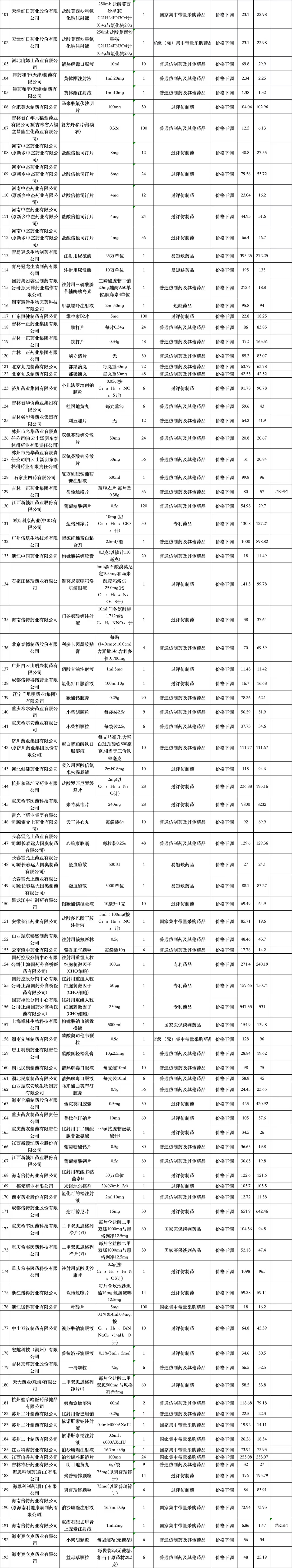 如国药集团容生制药(原天津药业焦作有限公司)申报的注射用三磷酸腺苷辅酶胰岛素(三磷酸腺苷二钠20mg,辅酶A50单位,胰岛素4单位)由212.4元降至18.8元,降幅约91%;山西国润制药的利巴韦林注射液(1ml:0.1g)从59.6元降至17.28元,降幅约71%。