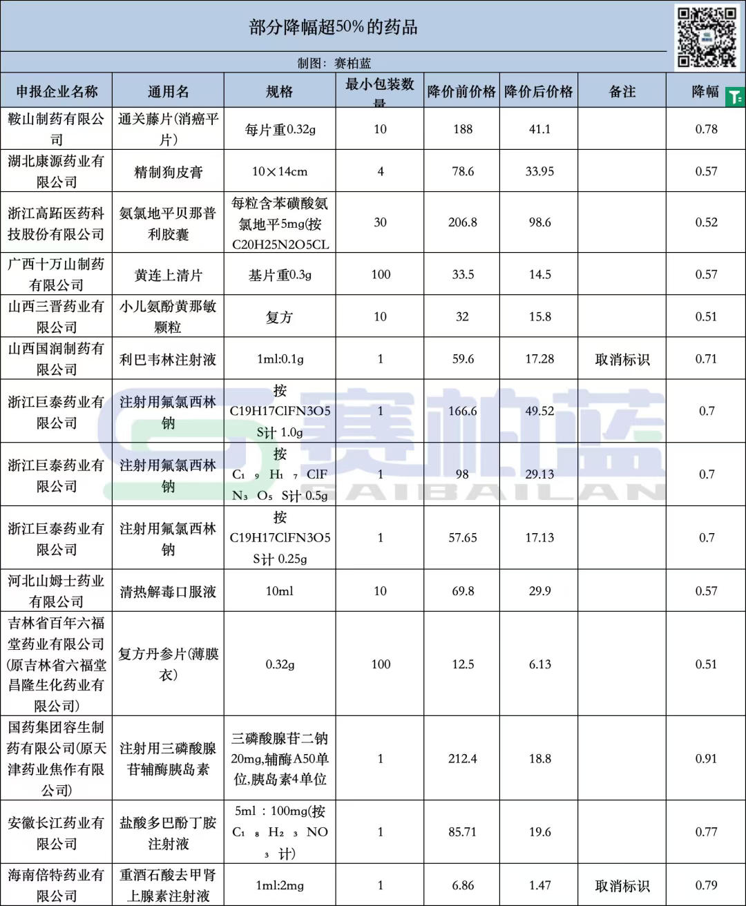 赛柏蓝观察发现,两批降价的药品中,共有37个药品降价达到50%及以上,约占9%,其中有药品最高降幅达到91%。