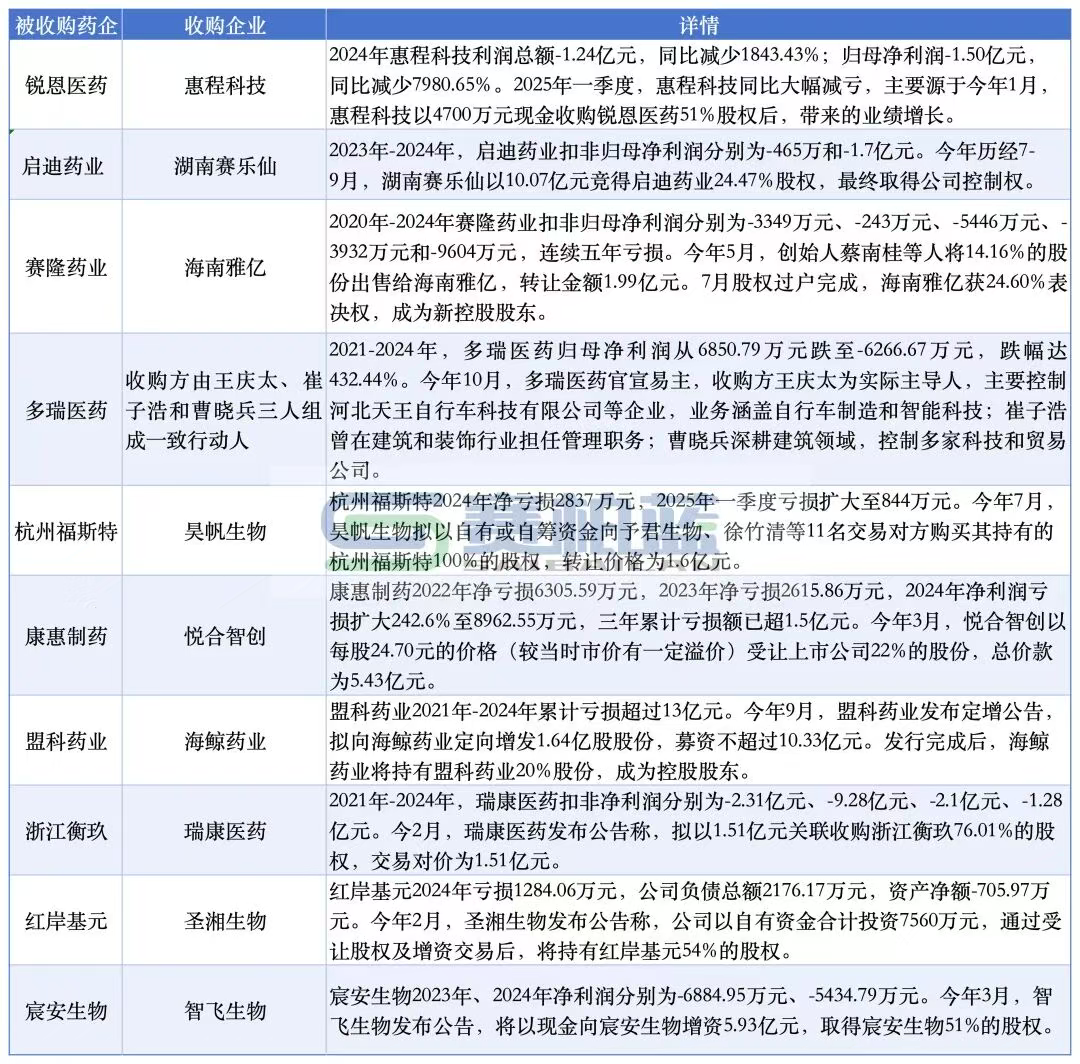 基于此,亚太药业控制权变更便成了自救的最后一搏。2025年以来至少超10家药企因亏损被收购,其中也不乏希望通过主动收购脱困的案例。