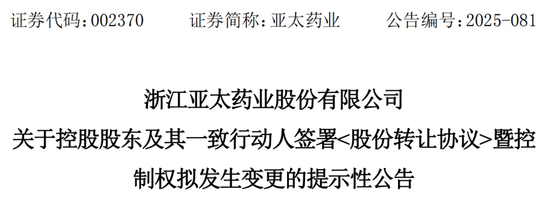 10月14日,浙江亚太药业股份有限公司(以下简称“亚太药业”)发布公告称,公司控股股东富邦集团及一致行动人汉贵投资与星浩控股及一致行动人星宸投资签署了《股份转让协议》。