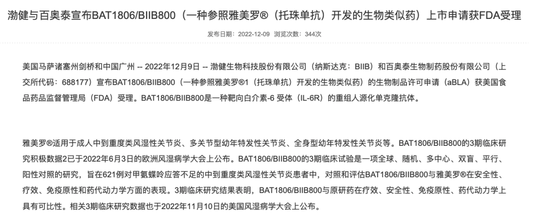 药融云数据库,www.pharnexcloud.com显示:2023年1月28日,国家药品监督管理局批准百奥泰生物施瑞立®(托珠单抗注射液)[规格:80mg/4mL]上市。目前首个[规格:400mg/20mL]已经成功纳入国家医保目录。在海外亦在上市申请审评中。需要注意的是,biosimilar通过全面的质量相似性研究、临床前研究、临床药物药代比对研究以及临床有效性和安全性比对研究,证明与原研药在质量、安全性和有效性上高度相似。