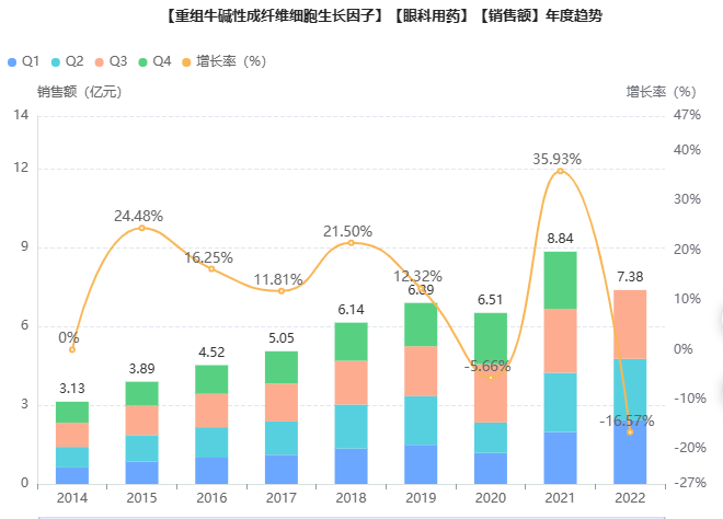 我们发现玻璃酸钠和透明质酸在医院这两年呈现下滑态势,但是重组牛碱性成纤维细胞生长因子眼用制剂2021年同比增长超30%,而这一干眼症眼药水由珠海亿胜生物独家生产。该药近年来在我国院内的销售额均超六亿元,2021年同比增长35.93%,达到8.84亿元。目前2022年前三季度的销售额已有7.38亿,预计全年将近十亿元。