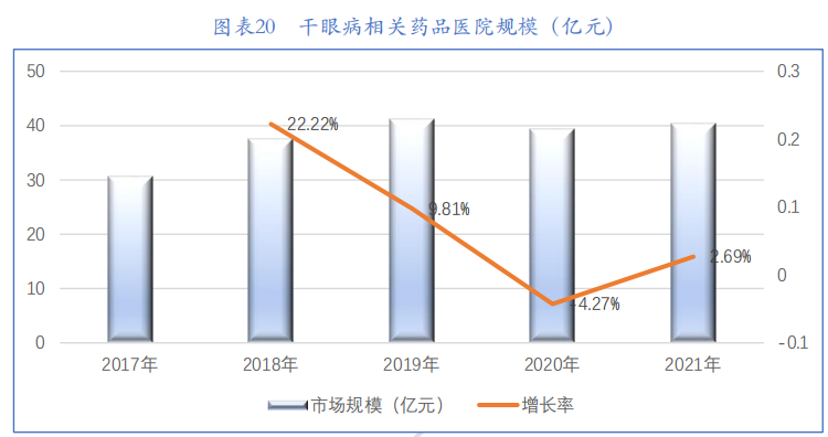 治疗方面,干眼症治疗渗透率低,治疗手段单一,未来更多药物、器械辅助治疗或手术的应用,或可促进细分市场的发展。根据药融云全国医院全终端数据显示,干眼症相关药品2020年的市场规模下滑,2021年医院销售小幅回升。由于该类产品的消费属性,预估零售终端的增长会领先医院市场(《中国眼科行业白皮书》:眼科用药TOP10品种和生产厂家,谁与争锋?)。