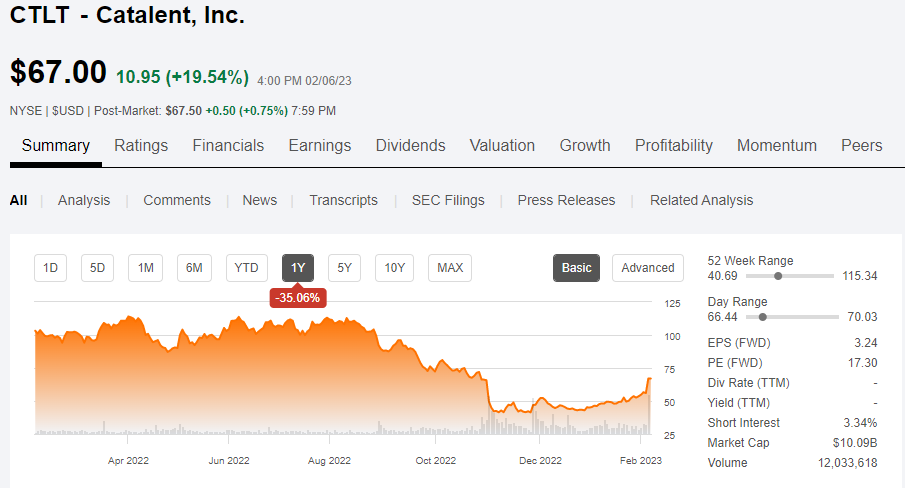 春江水暖鸭先知,华尔街已经在蠢蠢欲动。受到被收购消息刺激,Catalent股价昨晚大涨20%,不过近一年股价下跌35%。目前市值120亿美元。