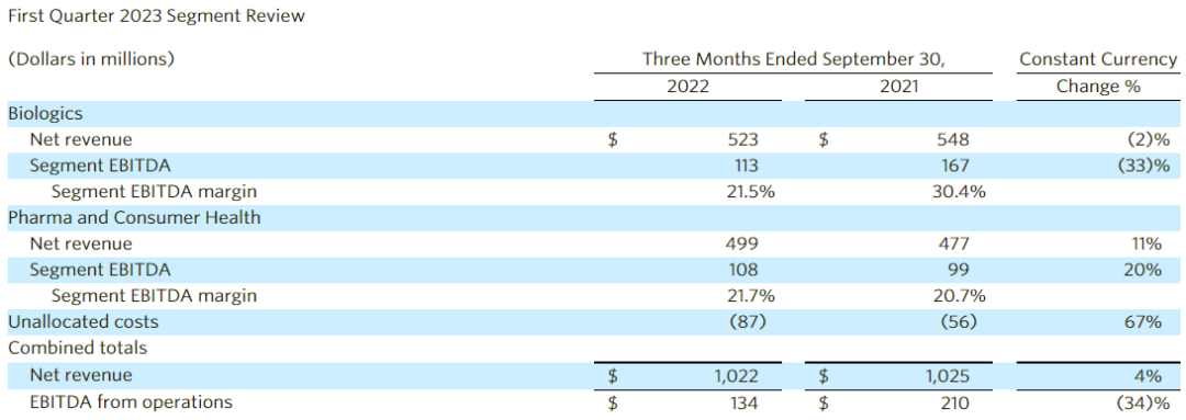 2023年第一季度(2022.7.01-2022.9.30)净收入为10.2亿美元(财年周期:2022.7.01——2023.6.30),按固定汇率计算,同比增长了4%,来自运营部分的息税折旧摊销前利润为1.34亿美元,同比下降34%。其中生物制品部门营收5.23亿美元。