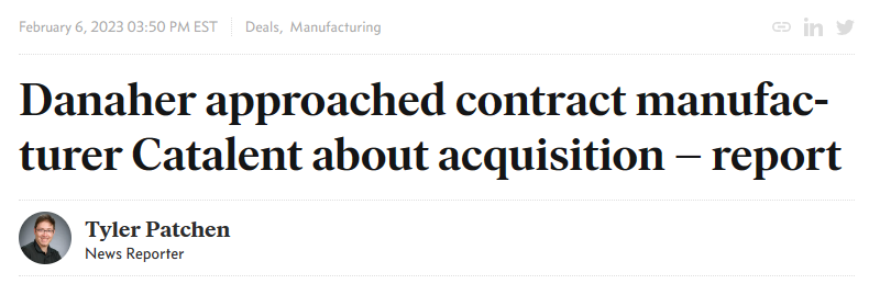 2月5日,彭博社报道,据知情认识透露,“并购之王”丹纳赫有意向收购全球CDMO龙头Catalent(《全球CDMO巨头Catalent:布局持续进化中!》)。“根据政策,Catalent不对市场传言和猜测发表评论,”Catalent发言人通过电子邮件发给endpts新闻,但截至发稿前尚未收到回复。