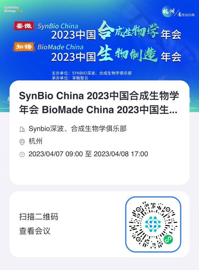 双螺旋结构提出70周年之际,为共同研讨合成生物学技术创新、应用平台、政策机遇。SynBio深波联合合成生物学俱乐部将于2023年4月在杭州举办“SynBio China 2023中国合成生物学年会”、“BioMade China 2023中国生物制造年会”,诚邀上级政府部门、科研院所、行业从业人员、投融资机构等合成生物学领域人士对话,多维度交流合作,鉴“微”而知“铸”,From SynBio to BioMade。