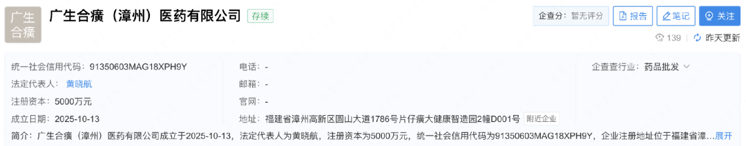 广生合癀注册资本5000万元,由片仔癀旗下福建片仔癀健康科技有限公司(持股49%)和福建广生堂药业股份有限公司(持股51%)共同出资设立,经营范围包括,药品批发、第三类医疗器械经营、食品销售等。
