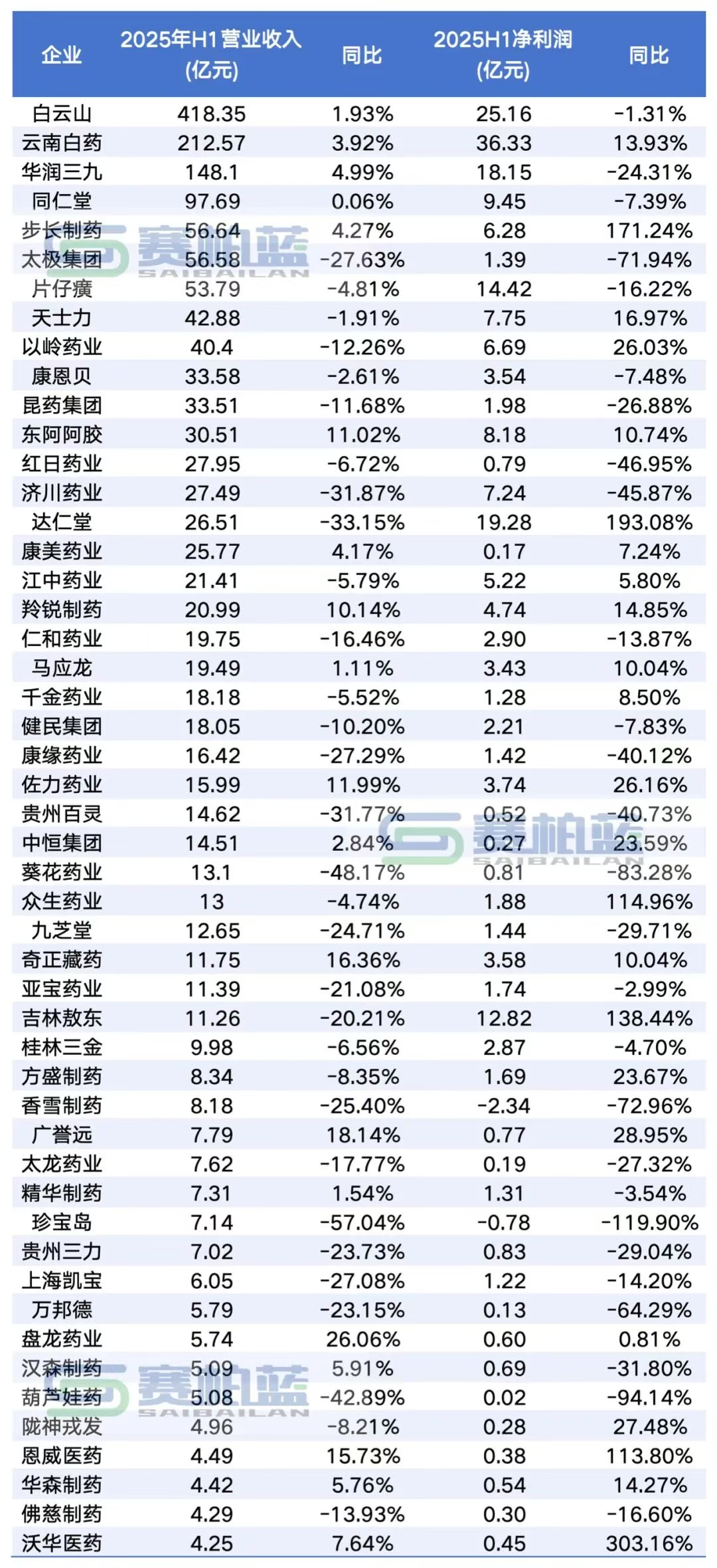 附:2025年上半年中药药企营收TOP50情况