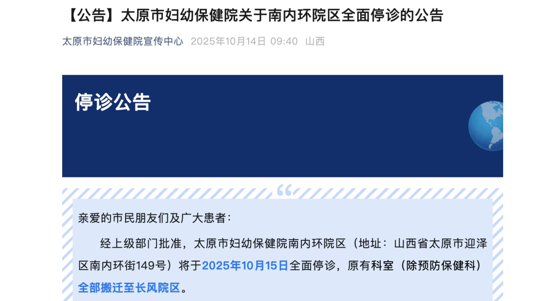 10月15日,太原市妇幼保健院南内环院区全面停诊,原有科室全部搬迁至长风院区,地址为山西省太原市长风西街113号。同时,南内环院区预防保健科继续提供免疫规划、孕产妇健康管理、儿童健康管理等工作。