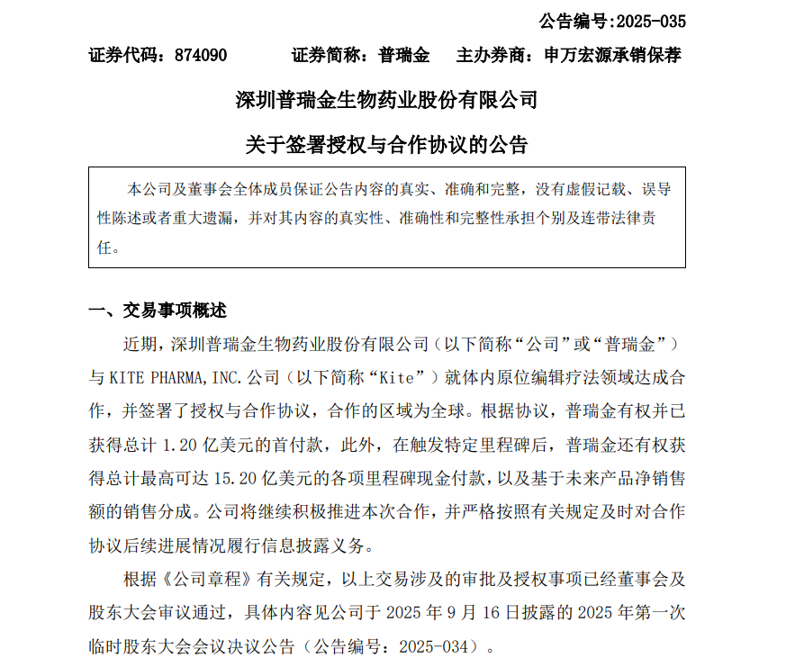 近日(10月16日),深圳普瑞金生物药业股份有限公司(以下简称 “普瑞金”)与吉利德子公司KITE PHARMA达成合作,并签署了授权与合作协议。本次全球合作旨在支持并加速下一代原位编辑疗法的研究与开发,致力于优化从早期发现到临床开发的全流程路径,以更高效的方式为患者带来具有潜在改变生命意义的创新疗法。