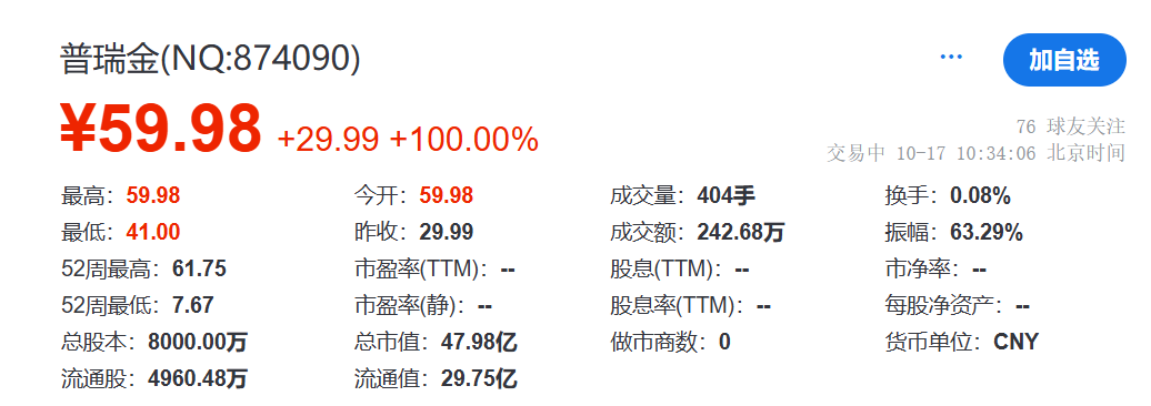受此消息影响,普瑞金股价大涨100%,17日收盘价29.99元/股,截止发稿时最新股价报59.98元/股。总市值47.98亿元。