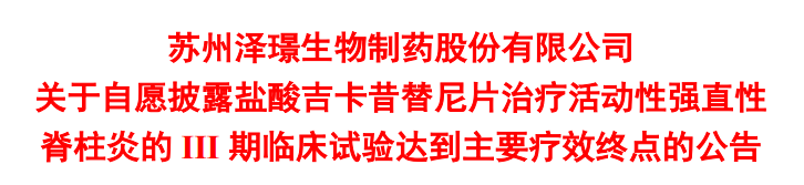 10月20日,泽璟制药发布公告,其自主研发的1类新药盐酸吉卡昔替尼片治疗活动性强直性脊柱炎的III 期临床主试验《盐酸杰克替尼片治疗活动性强直性脊柱炎患者的有效性和安全性的多中心、随机、双盲、安慰剂平行对照 III 期临床试验》(方案编号:ZGJAK029)达到了主要疗效终点,具有统计显著性(p<0.0001)。泽璟制药表示将加快推进盐酸吉卡昔替尼片治疗活动性强直性脊柱炎患者适应症的上市进程。