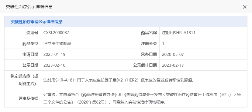 2月10日,CDE官网显示:恒瑞医药ADC新药“注射用SHR-A1811”拟纳入突破性疗法,拟定适应症为用于人表皮生长因子受体2(HER2)低表达的复发或转移性乳腺癌。