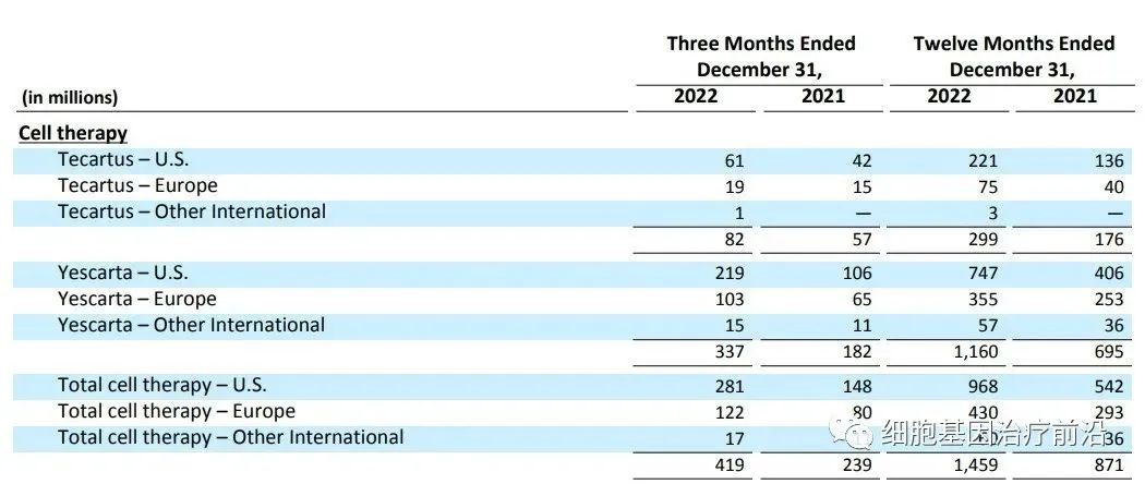 2月2日,吉利德公布了2022财报:全年总收入269.82亿美元,其中CAR-T疗法Tecartus全年营收2.99亿美元,另外一款疗法Yescarta营收11.6亿美元。两款CAR-T疗法总营收达到了14.59亿美元,同比增长67.5% 。