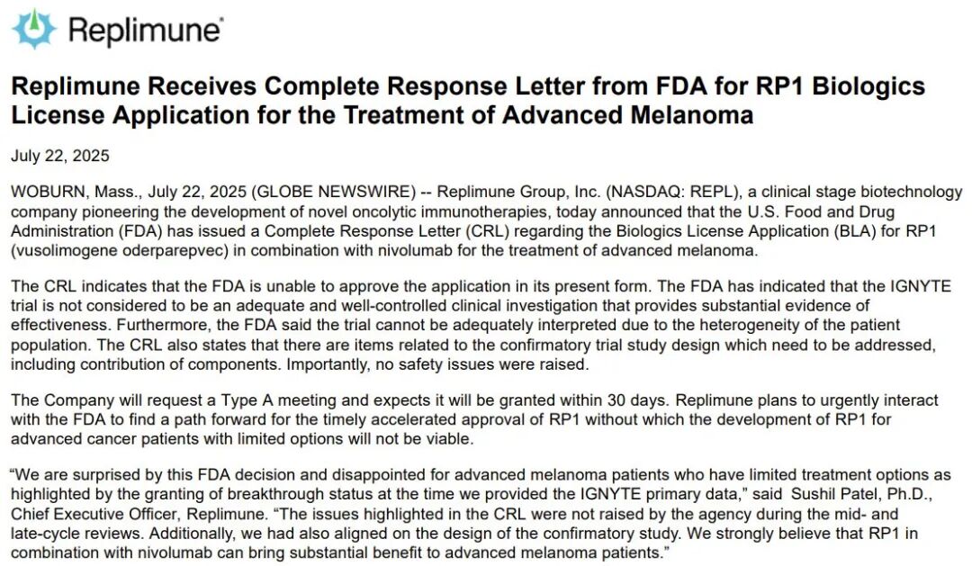 在2025年7月22日,Replimune宣布溶瘤病毒疗法RP1联合PD-1抗体治疗晚期黑色素瘤的上市申请收到FDA的完全回复函(CRL),FDA认为IGNYTE临床试验未能提供充分的疗效证据,并指出不能完全归因于受试人群的异质性,同时验证临床的设计也存在问题。