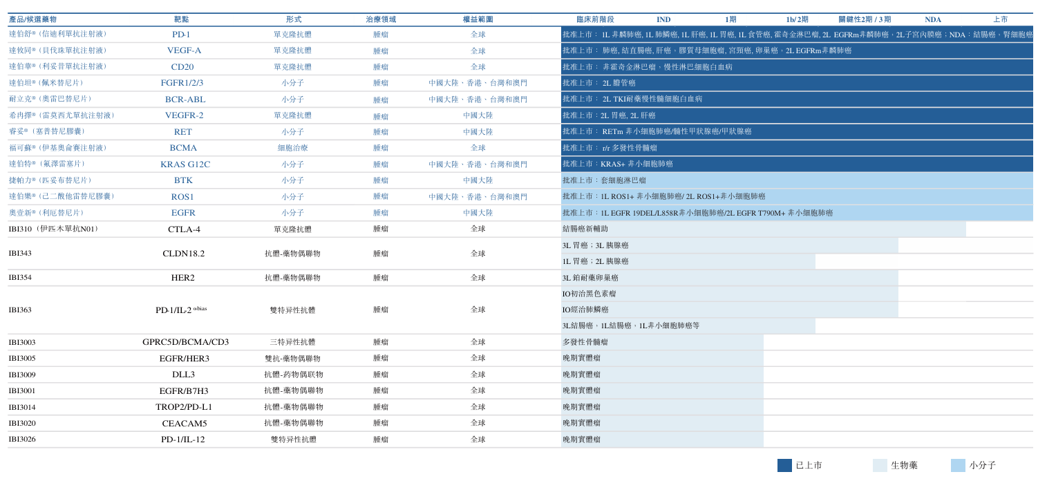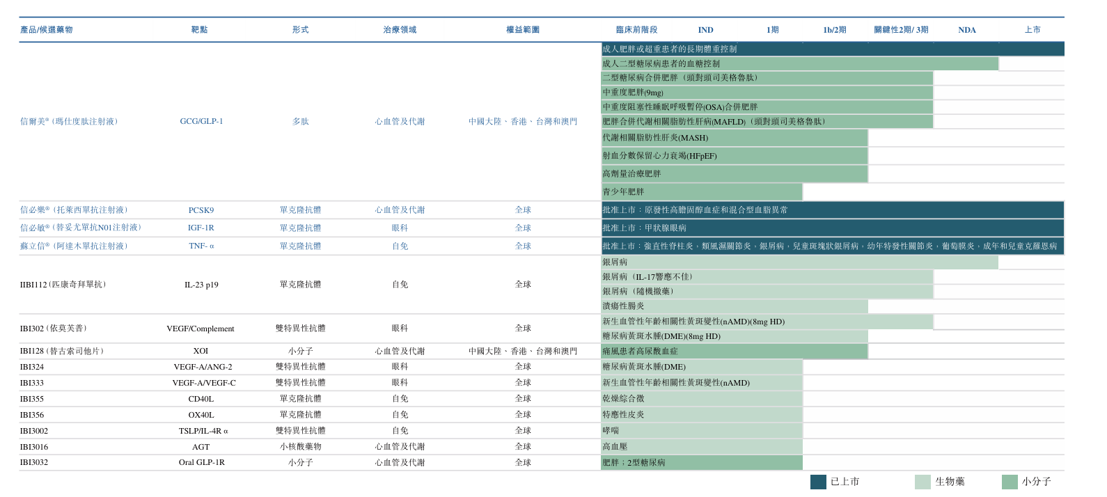信达生物管线布局具有前瞻性与创新性,通过自主研发与国际合作相结合的方式,构建了丰富且具有差异化竞争力的管线,公司致力于开发治疗癌症、心血管代谢、自身免疫及眼科疾病的开创性疗法。信达已推出16款产品上市,2个品种在NMPA审评中,4个新药分子进入3期或关键性临床研究,另外有15个新药品种已进入临床研究。