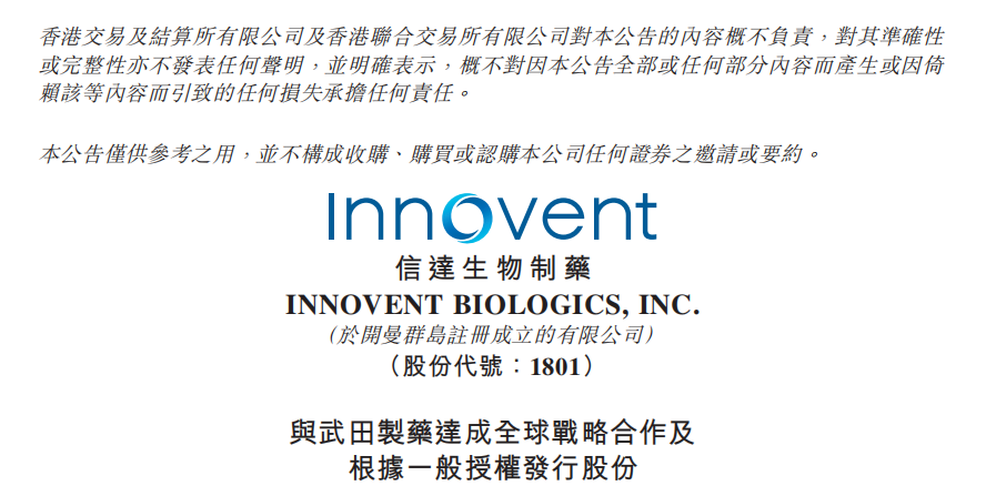 作为合作的一部分,Takeda Pharmaceuticals International AG(即认购人)与公司订立股份发行协议,据此,认购人已同意透过认购认购股份于公司进行投资,而公司同意向认购人配发及发行认购股份。认购股份将以现金方式按每股认购股份112.56港元的价格配发及发行予认购人,总港元代价相当于1亿美元(即约7.78亿港元)。认购股份将根据一般授权配发及发行。