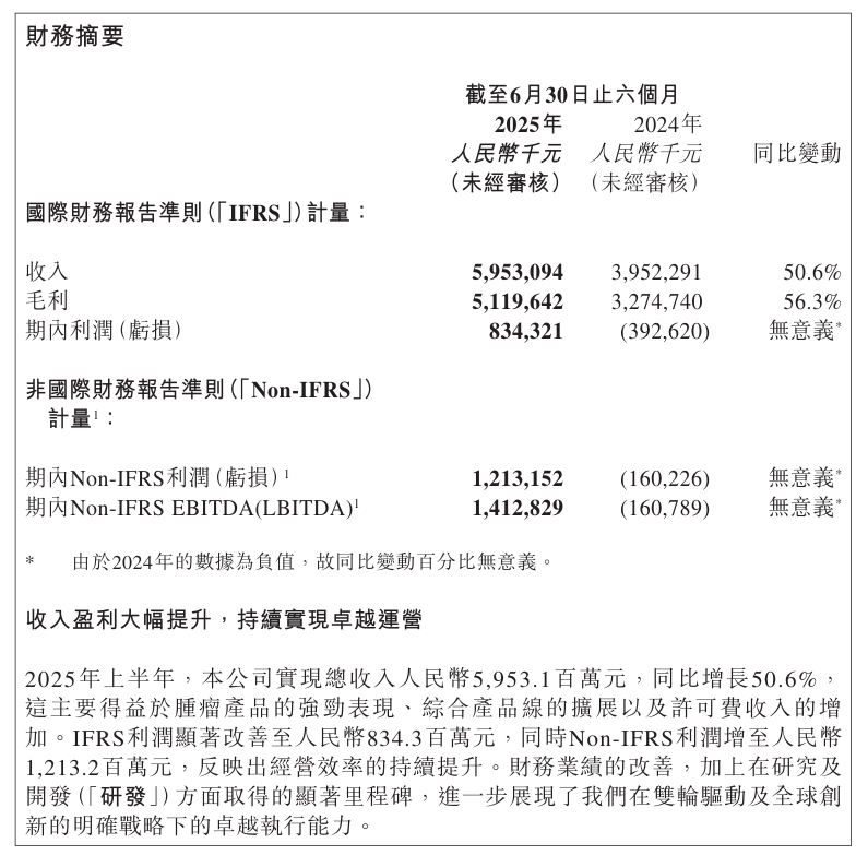 根据财报显示,信达生物上半年营业收入59.53亿元,同比增长50.6%;国际财务报告标准(IFRS)下实现净利润8.34亿元,去年同期亏损3.93亿元。非国际财务报告准则(Non-IFRS)净利润12.13亿元,去年同期亏损1.6亿元。其中,产品销售收入为人民币52.34亿元,同比增长37.3%,贡献核心收入增量;授权费收入达人民币6.66亿元,较去年同期的人民币1.16亿元显著增长,主要来自与罗氏Roche签订独家许可及合作协议所收取的首付款。