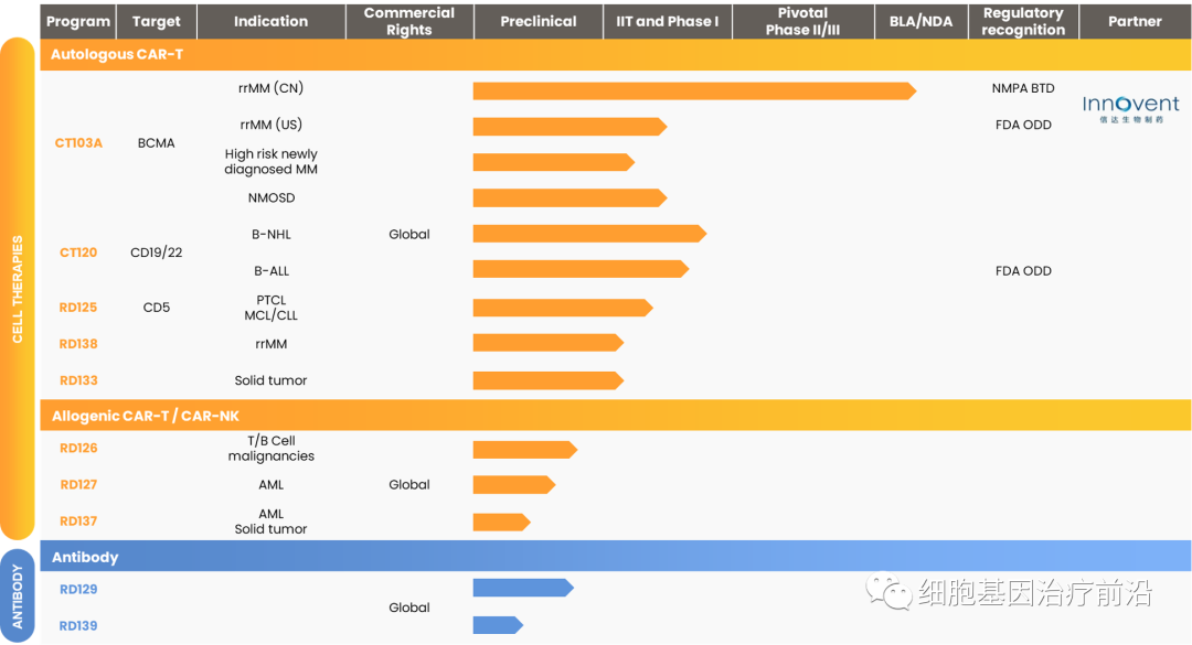 据药融云数据库显示,CT103A是一种针对B细胞成熟抗原(BCMA)的CAR-T细胞疗法,以慢病毒为基因载体转染自体T细胞,CAR包含全人源scFv、CD8a铰链和跨膜、4-1BB共刺激和CD3ζ激活结构域。基于严格的筛选,通过全面的体内外功能评价,CT103A具有强有力和快速的疗效,并有突出的体内持久存续性。驯鹿生物和信达生物正在合作研发CT103A针对RRMM在中国的临床应用。