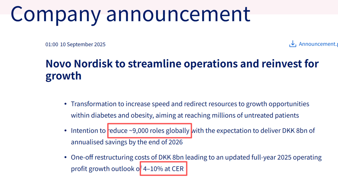 上任仅一个月,Doustdar便祭出"激进转型计划",9月10日宣布在全球范围内裁减9000名员工,占公司总人数的11.5%,其中丹麦本土将削减5000个岗位,预计到2026年底实现年化成本节约80亿丹麦克朗(约合12.45亿美元)(具体详见:9000人!诺和诺德推出全球裁员计划);