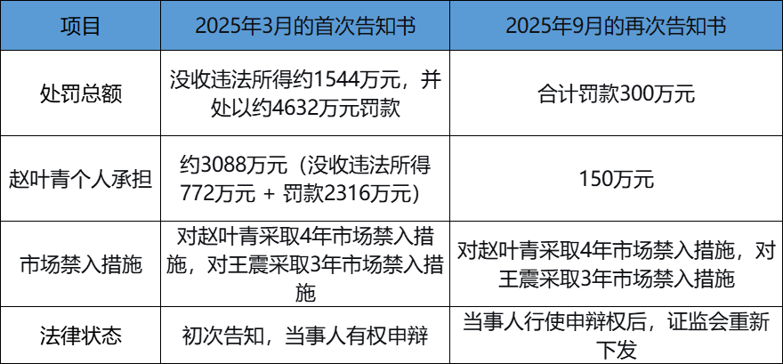 公开资料显示,因为赵叶青行使了申辩和听证的权利,证监会重新审理后作出了调整,此次下发的《告知书》相比较于2025年3月的首次告知中,拟没收违法所得并处以罚款的总额大幅降低;