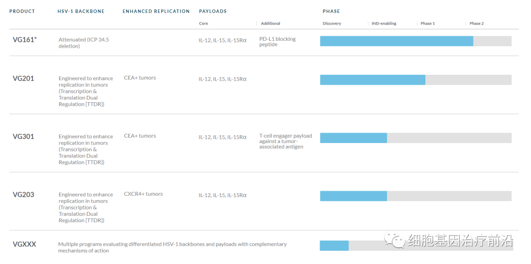 据药融云数据库显示,VG161是新型抗肿瘤免疫增强型I型单纯疱疹溶瘤病毒疗法,它同时携带IL12、IL15/15RA(IL15和IL15受体α亚基)和PD-L1阻断肽(PDL1B)的基因,是全球最早实现一个病毒表达4个具有协同性抗肿瘤免疫刺激作用的基因的溶瘤病毒。通过瘤内注射进入肿瘤组织,病毒在肿瘤细胞内复制和溶解肿瘤细胞的同时,携带的4个免疫刺激因子均被有效表达,实现了溶瘤活性与免疫刺激的协同。同时,病毒所表达的4个免疫刺激因子之间也发生进一步的协同增效,从而把抗病毒免疫反应转化为特异性的抗肿瘤免疫反应。