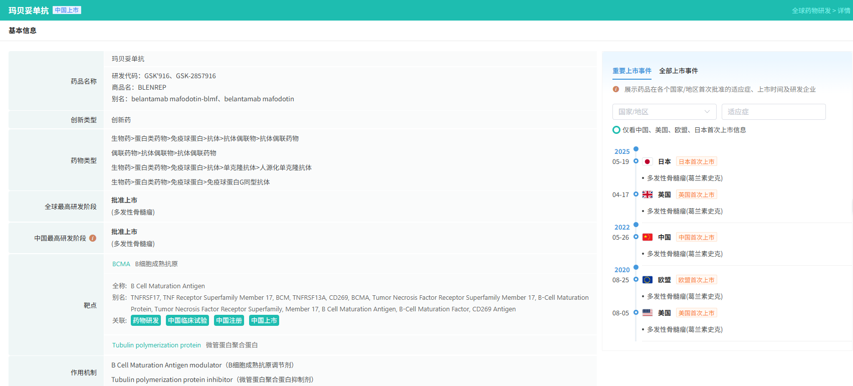 2025年10月23日,GSK宣布FDA已批准Blenrep联合硼替佐米和地塞米松(BVd),用于治疗接受过至少两种治疗(包括一种蛋白酶体抑制剂和一种免疫调节剂)的复发或难治性多发性骨髓瘤成人患者。