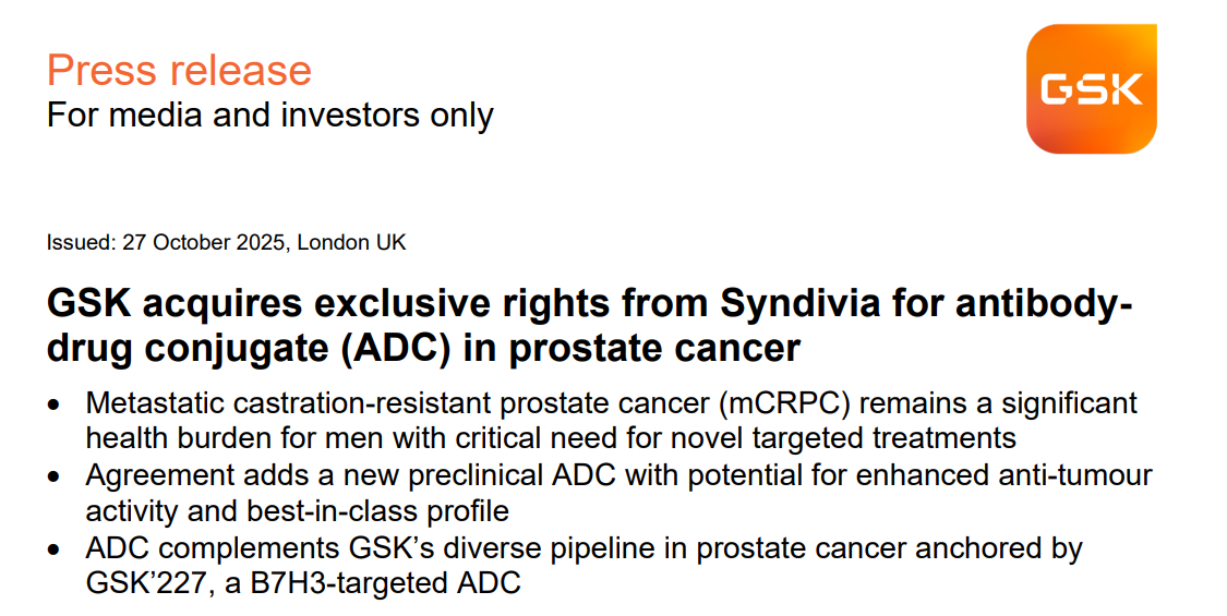 10月27日,葛兰素史克(GSK)宣布与Syndivia达成协议,获得一款用于治疗转移性去势抵抗性前列腺癌(mCRPC)的临床前ADC的全球独家开发及商业化权利。