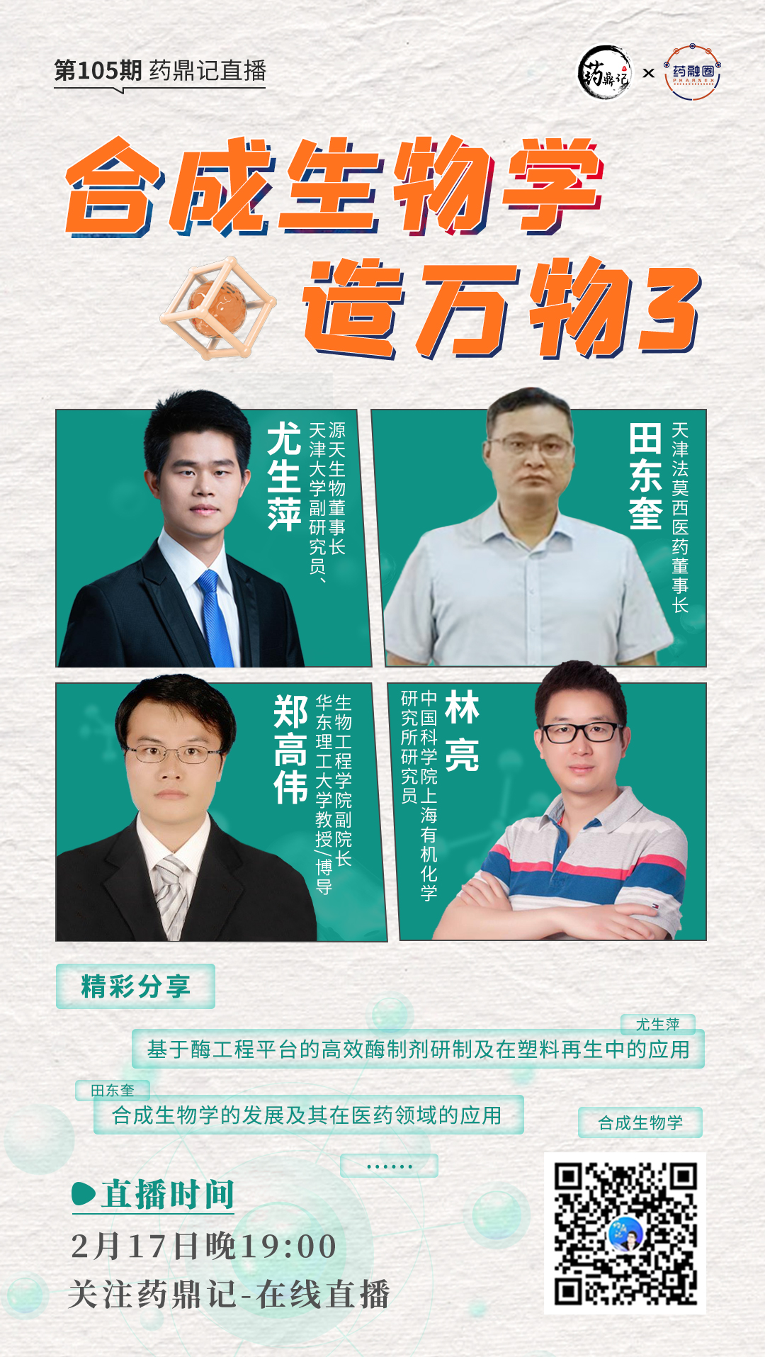 2月17日晚19点,“药鼎记”邀请了多位嘉宾为大家带来“合成生物学”相关知识分享,他们分别是: