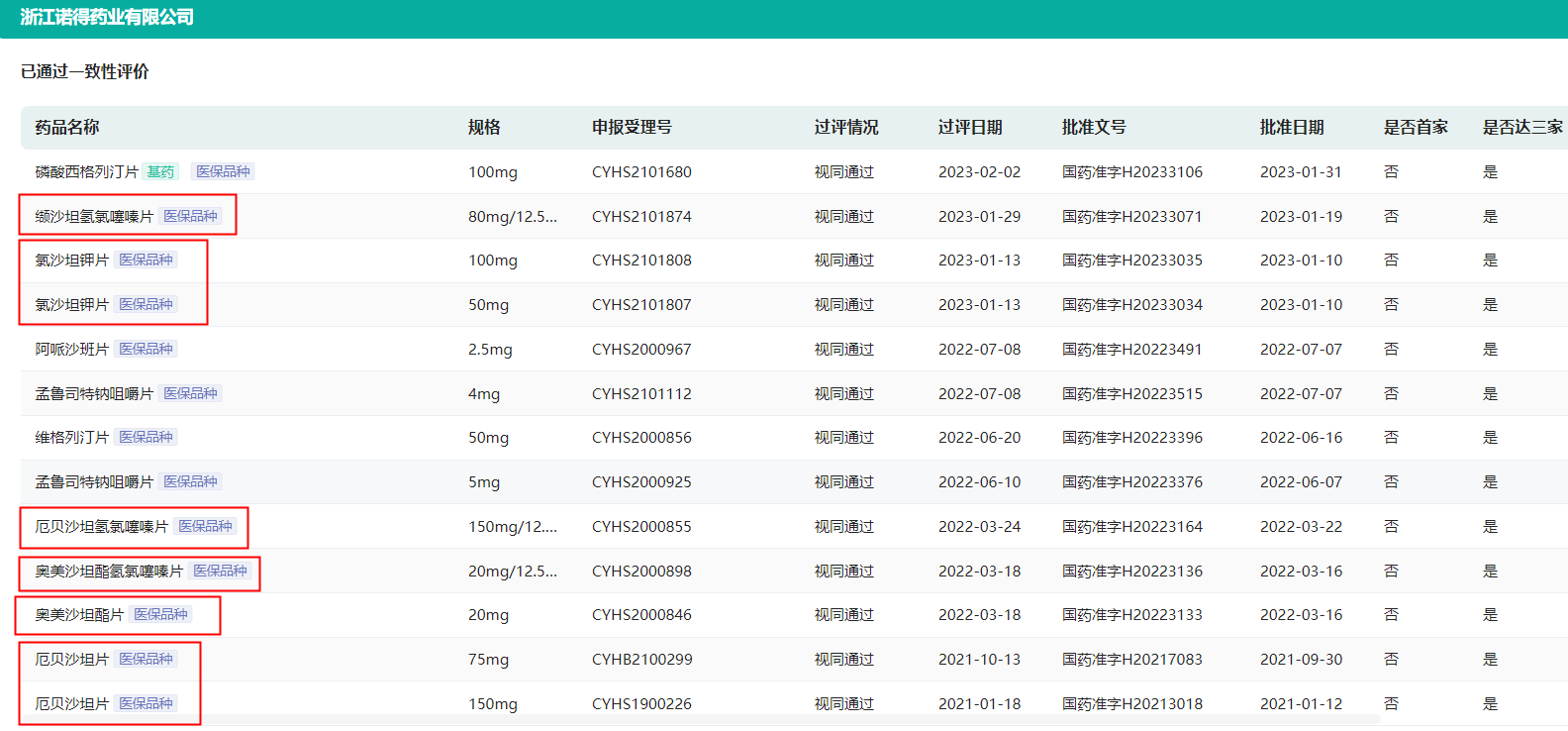 据药融云数据库,浙江诺得药业共有10个品种通过/视同通过仿制药一致性评价,其中氯沙坦钾片、缬沙坦氢氯噻嗪片、厄贝沙坦氢氯噻嗪片、奥美沙坦酯片、奥美沙坦酯氢氯噻嗪片、厄贝沙坦片等6款均为降压药物、均为医保品种、过评企业均达三家。