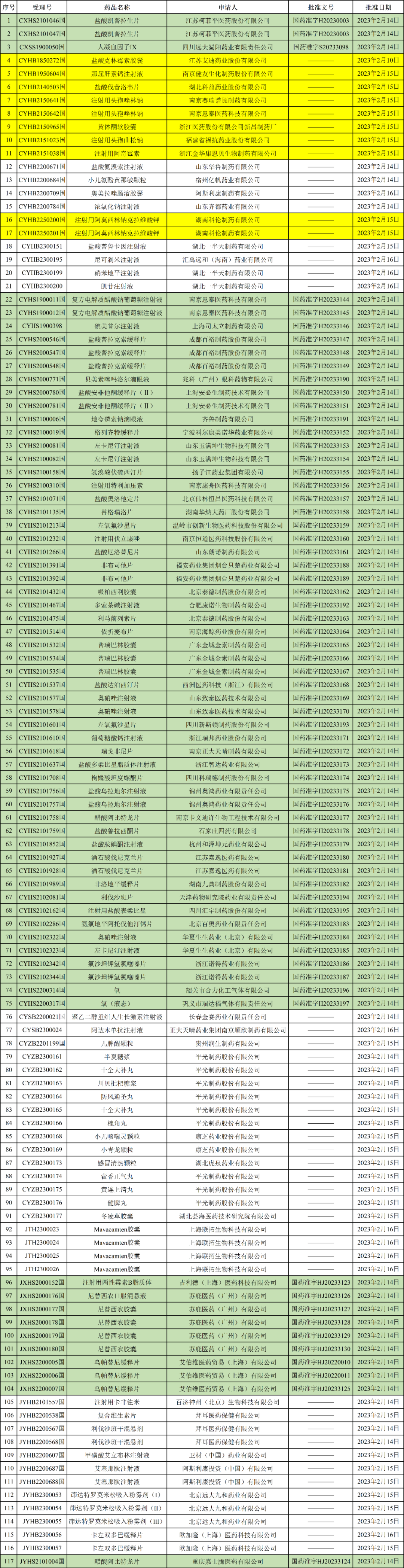 NMPA发布2023年02月20日药品批准证明文件送达信息,本批次共有117个受理号获批,其中10个为一致性评价受理号获批,包括:
