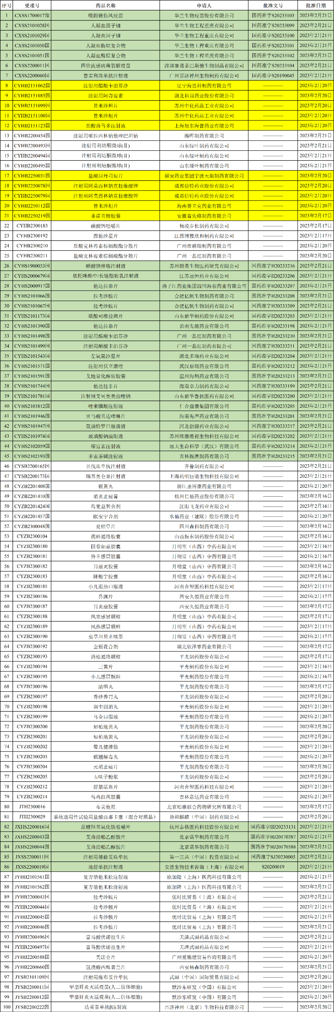 2023年02月24日,NMPA发布最新药品批准证明文件送达信息,本批次共有100个受理号获批,其中10个为一致性评价受理号,包括: